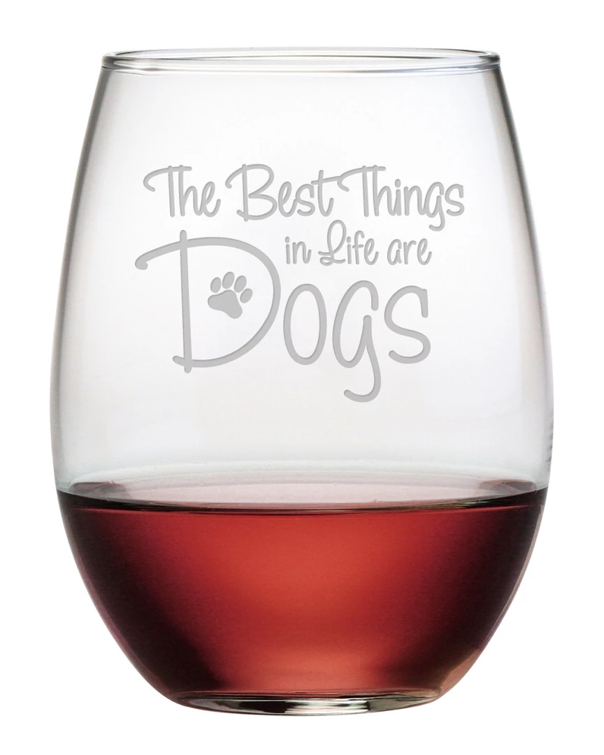 - Each stemless wine glass features a sand etched ‘The Best Things in Life are Dogs’ and ghost design.