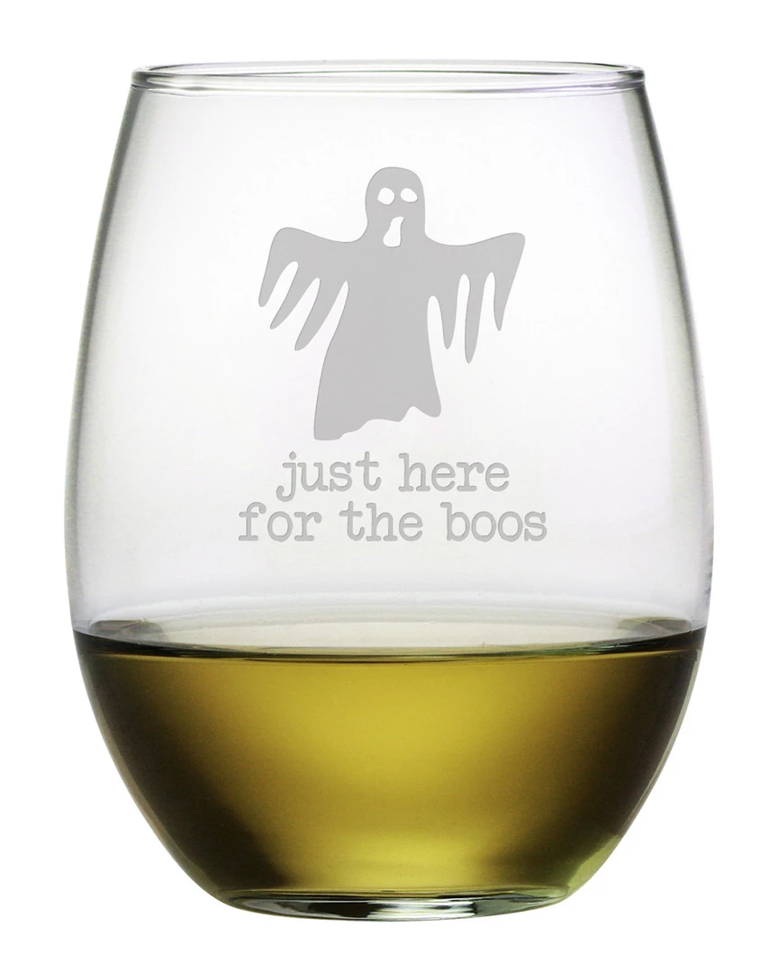 - Set of four stemless wine glasses with hand-etched “”just here for the boos”” and ghost design