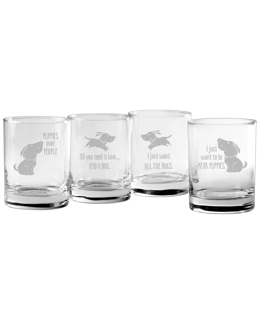 - Design details: Each 14-ounce rocks glass in this set of four is deeply sand etched with a different humorous dog-themed design. It’s the perfect gift for dog lovers.