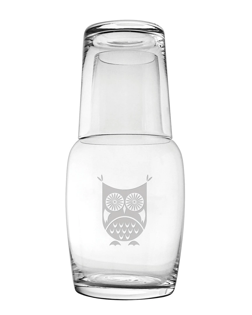 - Perfect for the desk or bedside table, each set includes a 32-ounce water carafe and a glass, which doubles as the lid. The carafe features a deeply sand etched owl design. Decorated in the USA.