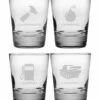 - Set of four stemless glasses with sand-etched horse shoe designs