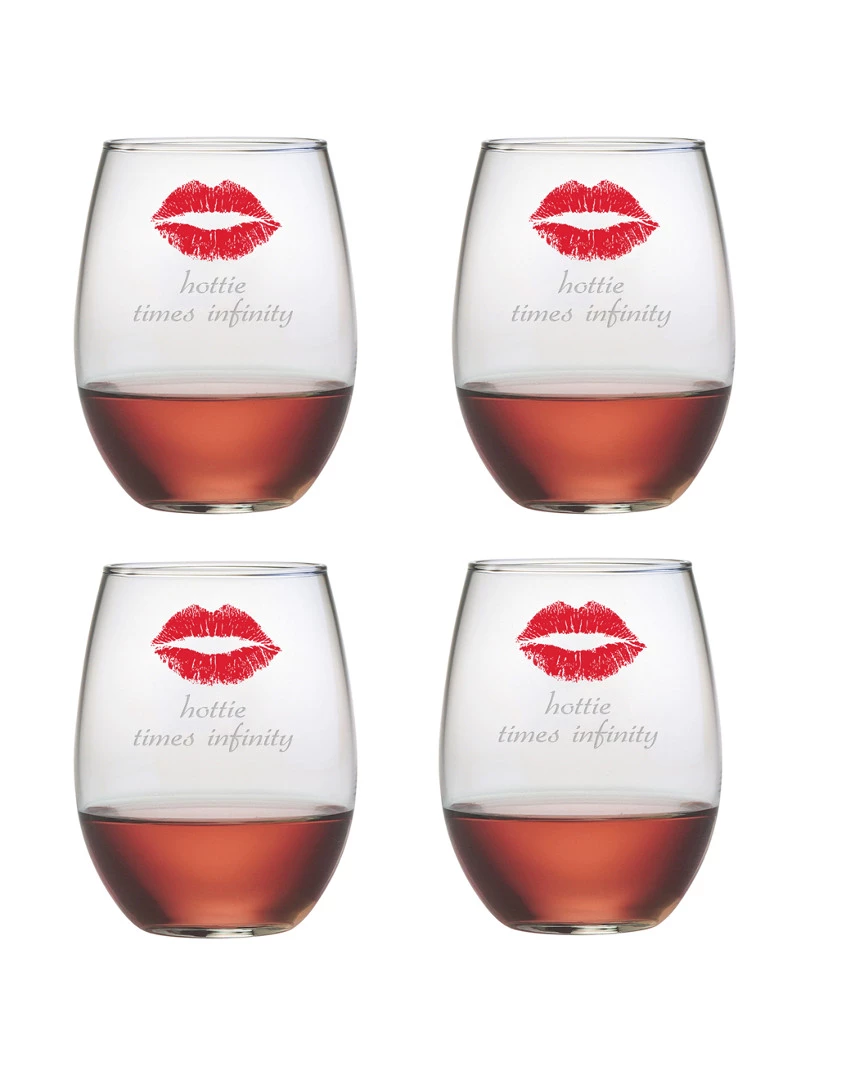 - Set of four hand-decorated clear stemless glasses with etched “”hottie times infinity”” text and a red silkscreened ink design