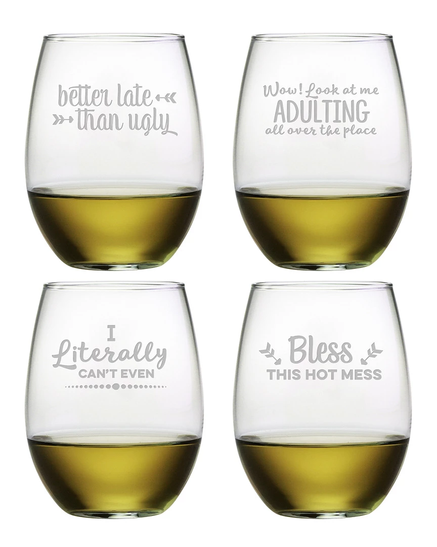 - Versatile enough for water, wine, and juice, each 21-ounce stemless tumbler in this set of four features a different deeply sand etched typographic design. The stemless shape means they’re dishwasher safe and less prone to breakage than their stemmed counterparts. Made and decorated in the USA.