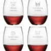 - Design details: Versatile enough for water, wine, and juice, each 21-ounce stemless tumbler in this set of four features the a sand etched design. The stemless shapes means they’re dishwasher safe and less prone to breakage than their stemmed counterparts. Made and decorated in the USA.