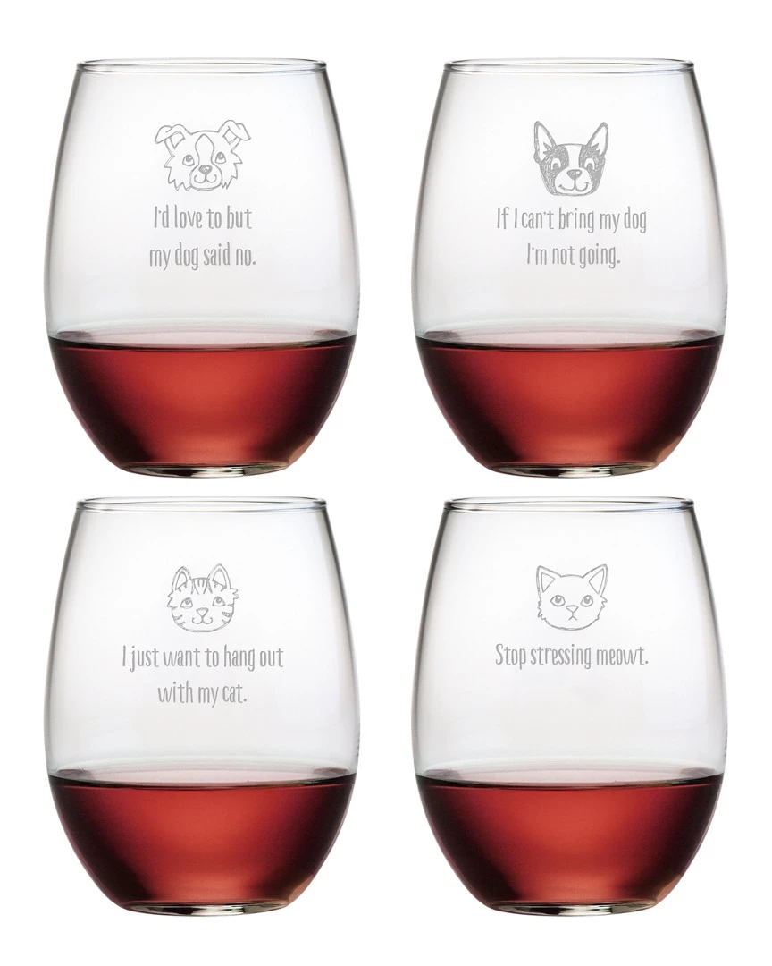Susquehanna Glass Set Of 4 Cats & Dogs Assortment Stemless Wine Tumblers Home Pet Supplies
