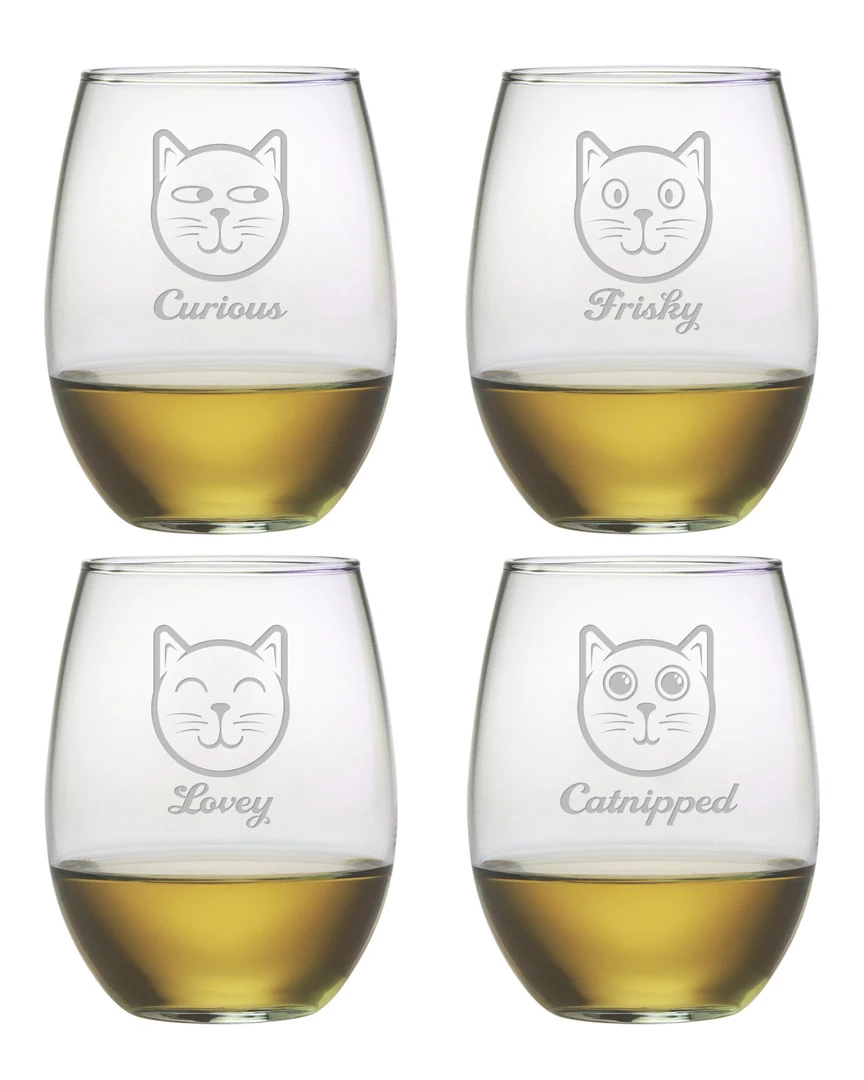 Susquehanna Glass Set Of 4 Feline Faces Assortment Stemless Wine Tumblers Home Bar Carts & Accessories