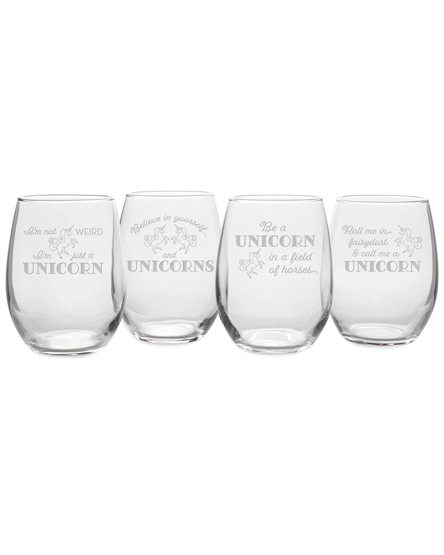 - Versatile enough for water, wine, and juice, each 21-ounce stemless tumbler in this set of four features a different deeply sand etched unicorn design. The stemless shape means they’re dishwasher safe and less prone to breakage than their stemmed counterparts. Made and decorated in the USA.