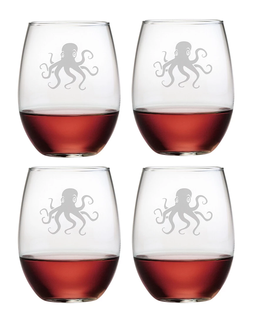 Susquehanna Glass Set Of Four Octopus 21oz Stemless Wine Glasses Home Bar Carts & Accessories