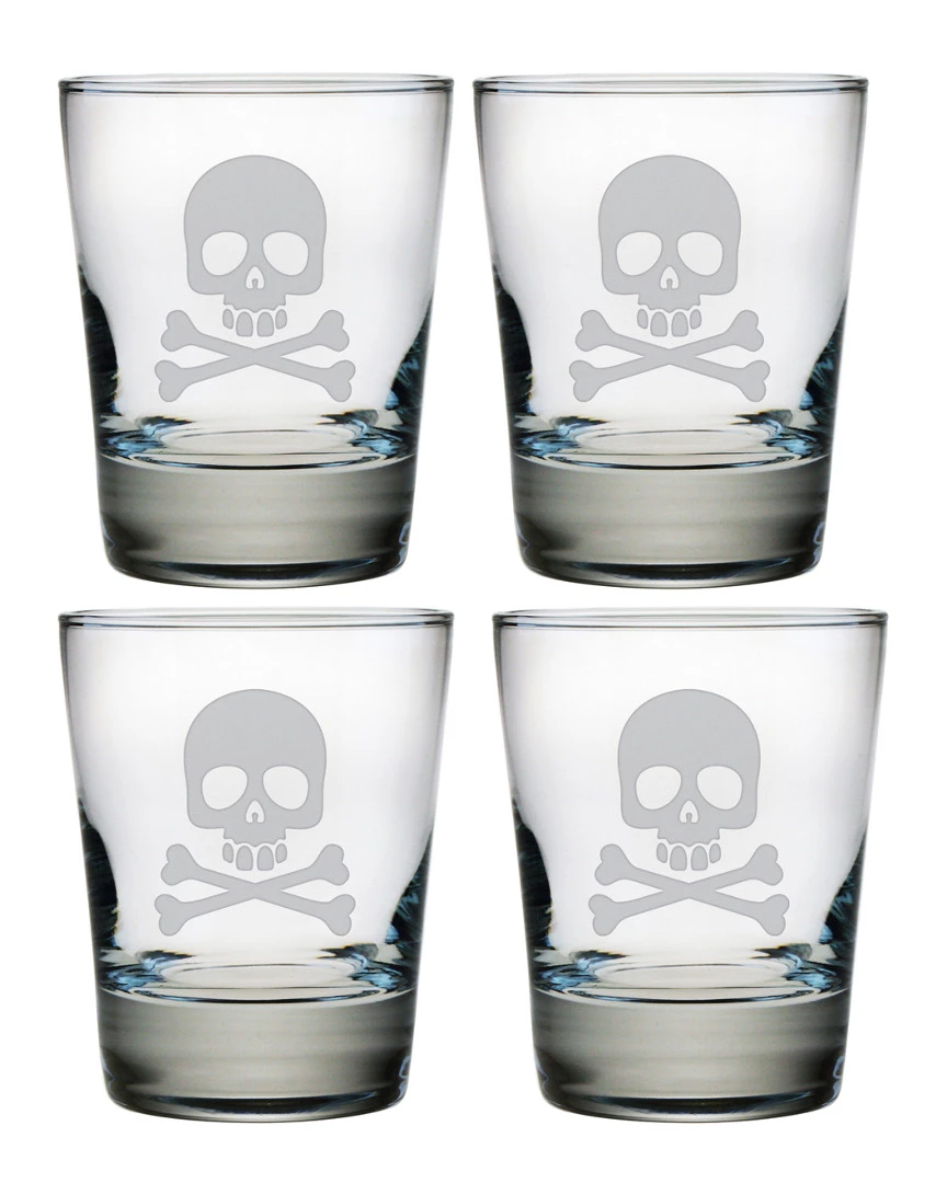- Set of four double old-fashioned glasses with sand-etched skull and crossbone designs