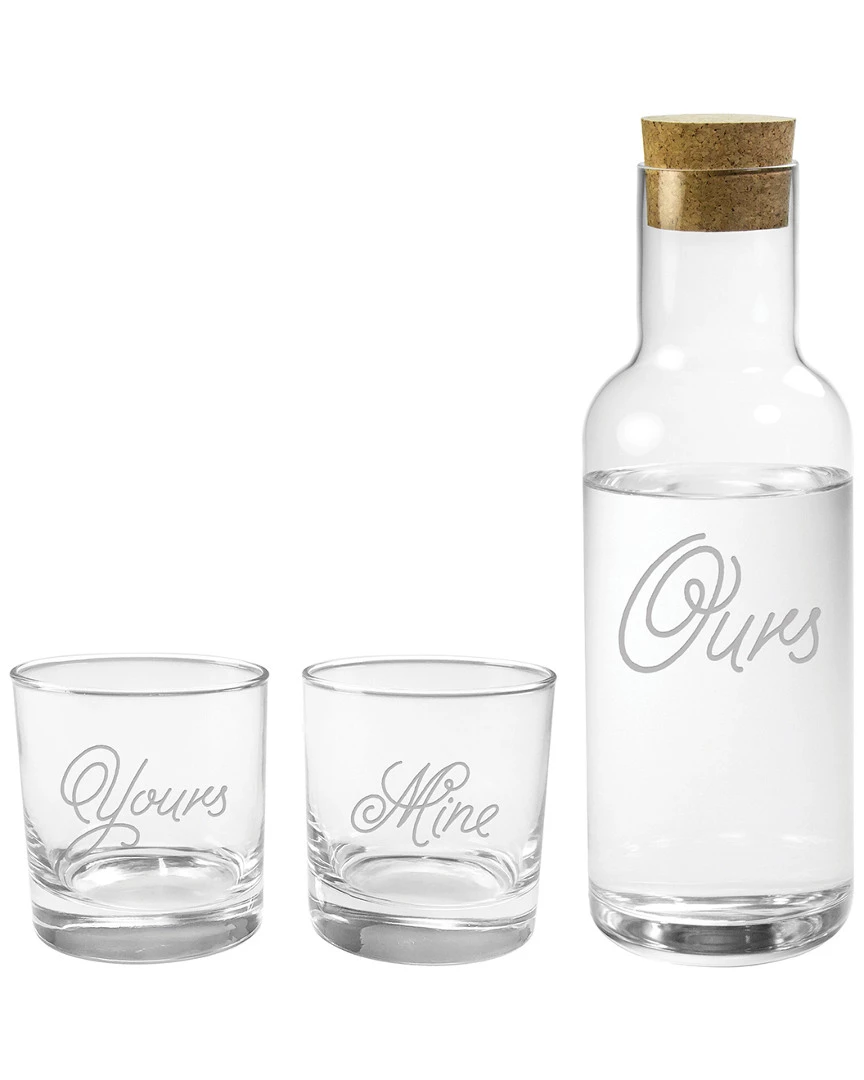 - Design details: Suitable for water, wine, or spirits, this Yours Mine Ours Sublime Carafe 3-Piece Set is the perfect gift for the happy couple. Each lead-free, break-resistant, and ultra clear 34-ounce carafe comes with a cork stopper and two classic lowball tumblers. While the glasses are deeply sand etched, one with Yours, and the other Mine, the carafe is etched with Ours. Decorated in the USA.